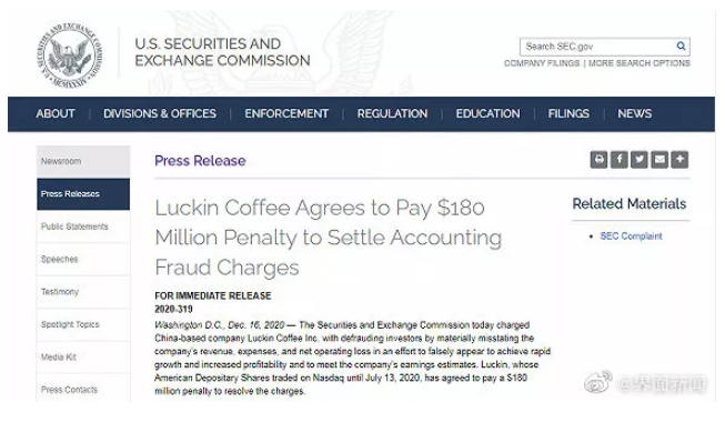 当地时间12月16日,美国证券交易委员会(SEC)宣布,瑞幸咖啡同意支付1.8亿美元和解对其会计欺诈指控。SEC称,从2019年4月至2020年1月,瑞幸通过关联方虚假交易伪造了超过3亿美元的销售额。...