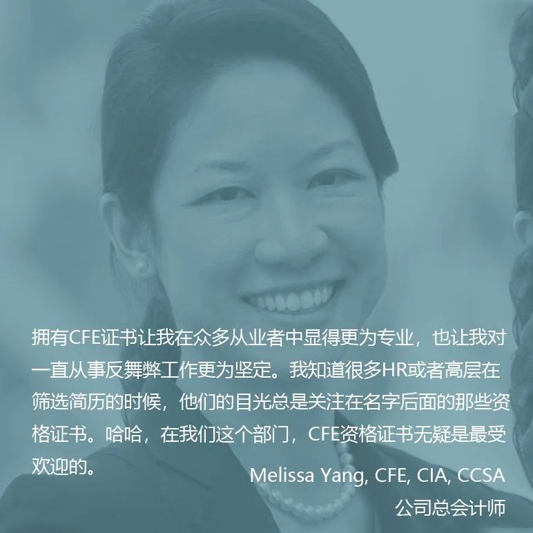 关于CFE证书 About CFE certificate 随着我国经济建设的高速发展及法制建设的不断完善,许多国内的企业内部都已设有法务部门,法务部门的从业人员大多是具备法律与会计知识,企业的高级会计师、财务总监、注册会计师等必须熟知法律知识。 目前,我国的反腐倡廉建设正在如火如荼的进行当中,需要大量既精通会计知识又熟知法律知识,所以在当今社会,反舞弊领域的相关专业人存在很大的缺口。 如何应对企业的公司治理、内部控制风险管理、如何帮助中国的企业做强做大走出国门,已是刻不容缓,这既是国家的需要、社会的需要,同时也是走向世界、与国际市场接轨的需要。 合规/反舞弊从业者需要同时具备财经、金融、法律、犯罪学、心理学等相关领域的知识背景和一套独特的技能。 美国注册舞弊审查师(Certified Fraud Examiners, CFE)资格证书是国际舞弊防范和调查领域的金牌证书,获得这一证书标志着持证人在舞弊预防、调查和威慑等方面拥有过硬的专业知识。 完善的课程体系,系统介绍舞弊和舞弊风险警示和信号的识别,以帮助企业界定舞弊风险高发区,建立和实施舞弊风险防控计划,做好预防和威慑; 掌握舞弊调查的流程和有效的方法和注意事项,撰写合格的调查报告,尽力挽回组织的经济损失,维护组织形象;以及熟悉和舞弊相关的法律法规和司法诉讼流程。 根据ACFE协会2018年全球调查报告显示,雇佣CFE的企业,其发现舞弊的速度比没有雇佣CFE的企业要快50%以上,舞弊造成的经济损失也会比没有雇佣CFE的企业要低62%以上。 证书优势 Certificate benefits 持证人感言 Testimony of the certificate holder 考试科目 Test Subject 1 财务交易与舞弊类型 Financial Transactions & Fraud Schemes 测试您对会计记录中发生的舞弊性金融交易类型的理解。要通过这门课程,您需要证明自己具备以下知识和技能:基础会计和审计理论,常见舞弊类型,降低舞弊发生的内部控制以及其他审计和会计事项。 2 法律 Law 确保您熟悉进行舞弊调查的许多法律程序和后果,包括刑法和民法,证据规则,被告和原告的权利以及专家证人等。 3 舞弊调查 Investigation 包括有关访谈,问询,发表声明,从公共记录中获取信息,追踪非法交易,评估舞弊和撰写报告的问题。 4 舞弊防范与威慑 Fraud Prevention and Deterrence 测试您对人们为何实施舞弊的理解以及防止舞弊的手段。本课程涵盖的主题包括犯罪因果关系,白领犯罪,职业舞弊,舞弊预防,舞弊风险评估以及ACFE协会颁布的职业道德守则。 考试资格 Test Qualification 考试步骤 Examination steps 1 成为ACFE协会会员 成为ACFE协会的准会员是CFE认证的第一步。CFE考试资格采用积分制,需具备至少50分才能参加考试。评分规定如下:每完成一年大学课程,可得10分,从事与舞弊查核有关的工作,每满一年,可得5分。 2 准备CFE考试 成为ACFE协会会员学习“ 舞弊审查师手册”(Fraud Examiners Manual)。“舞弊审查师手册”是一个2000页的指南,介绍考试技巧和程序。 3 申请参加CFE考试 填写在线申请表并提交付款,上传相关证明资料。 4 通过CFE考试 考试形式为计算机考试,考试时间非常灵活。只要能连接到网络,考试地点不限。每门课程有100道单项选择题,每门考试时间为2小时15分钟,提前考完可以提前结束考试,75分合格。 考试细则 Examination rules 1 预约CFE考试 ◎ 考试需要提前进入预约系统预约考试时间,从进入预约系统开始倒计时60天,需要在60天内考完四门考试,科目顺序和时间可自行选择; ◎ 预约成功之后不能更改时间,必须按时参加考试。 2 参加CFE考试 ◎ 预约成功之后邮箱会收到考试信息,考试之前15-30分钟输入相关信息即可进入考试; ◎ 考完当场出成绩,邮箱会收到考试成绩。 3 CFE考试要求 ◎ 您的考试地点须选择在无噪音和其他干扰,四周有围墙的密闭式内进行; ◎ 考试期间,任何第三方不得在场或进入房间,如果有该情况发生,您的考试将被终止或成绩无效; 4 CFE考试补考 ◎ 如果有未通过的科目,可进行补考,补考费用100美金/门,交完补考费可重新预约考试。 注意:CFE考试只有3次机会,若3次考试未通过,将不得再考CFE。 提示:通过ACFE China报名CFE考试,教务老师将全程协助您完成。