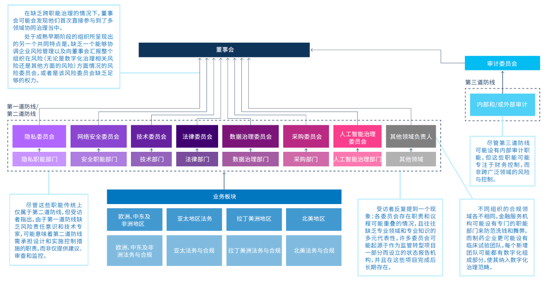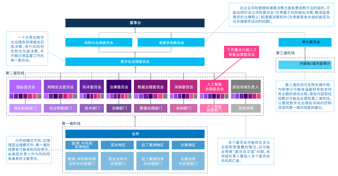 什么是组织数字化治理? 许多组织都在纠结是否要对数字化治理进行定义,以及该如何定义并协调数字化治理相关事宜。 这种纠结的部分原因在于不断变化的宏观环境,以及数字化治理所涵盖的众多且多样的主题领域。 我们所说的组织层面的数字化治理,指的是为组织在处理与数字技术相关的社会技术、战略和监管领域事务时,确立角色、职责和问责机制的架构和框架。 从广义上讲,数字化治理涵盖了隐私与数据保护、人工智能治理、网络安全、内容审核、网络安全、平台责任、数字可及性、数据治理以及伦理道德等方面的任意组合。当版权、贸易、执法与国家安全、竞争、第三方管理以及公民权利等方面与公司对数字产品和服务的开发、使用或部署产生交集时,与之相关的治理需求也可纳入数字化治理的范畴。 在一个组织内部,数字化治理的职责在不同的防线中或多或少都有所体现。 第一道防线:一线团队 一线团队承担并管理风险,并且很可能在诸如业务和产品团队等不同的业务职能部门中开展工作。他们可能负责通过设计和实施适当的风险缓解控制措施来管理运营风险。 第二道防线:专家/监督团队 这主要由那些在治理、风险管理和合规方面进行监督或提供专业领域知识的团队组成,例如风险管理团队、隐私保护和信息安全团队。他们可能负责帮助一线团队建立风险缓解控制措施,监控这些措施的有效性,并制定风险管理的政策和程序。 第三道防线:保障团队 内部审计团队提供独立的保障,以确定前两道防线中的团队是否在有效地运作。其职责可能包括向管理层提供独立的报告。 传统模式治理 为了应对技术的不断发展,组织治理一直在自然地扩展和演变。 一个组织的传统模式治理试图在各个子领域内部并通过这些子领域来实施数字化治理,但却没有一个明确界定或协调统一的数字化治理方法。 大多数接受采访的领导者表示,他们所在的组织在设计和实施数字化治理框架方面的思考和工作还处于早期阶段。这并不是说这些组织没有在实施数字化治理;而是说,他们是在现有的架构体系中并基于这些架构来开展数字化治理工作的,而这些现有的架构在很大程度上并没有通过数字化治理项目进行协调或整合。我们将这种治理方式称为传统模式治理。 在构建和完善数字化治理方法的过程中,需要克服的挑战包括: 各个第二道防线职能部门的成熟度不足。 第一道防线对风险缺乏认知、责任意识和(或)担当精神。 第一道防线以及整个组织期望第二道防线来设计并实施控制措施,这影响了第二道防线独立测试和监控这些控制措施的能力。 下一页的组织结构图展示了一个数字化治理方面的高层级示例组织结构。各委员会很可能是为了直接应对监管法规和政策的发展而设立的,其职责是监督合规要求的落实情况。随着相关项目取得成果,这些委员会中的许多可能会转变为问题升级处理的节点。 借助技术实现合规的本质上可能会受到限制,因为会使用从传统工具到从众多第三方采购的各种工具,来解决相互重叠的问题。 增强型治理 强化治理可实现更优的风险管理。 组织的增强型治理模式旨在通过明确且结构化的数字化治理框架,借助各种跨学科流程和架构来实施数字化治理。 在数字化治理方面拥有更明确和/或更成熟方法的组织中,高层领导者指出了一些使其能够采取更协调的数字化治理方式的组织结构特征,包括: 由领域负责人主持的特定领域委员会,例如由首席隐私官(CPO)领导隐私委员会,并根据需要吸纳其他领域代表参与,如采购部门负责人出席隐私委员会并进行汇报。 人工智能治理的兴起凸显了以下两方面协调的必要性:一是负责有效部署人工智能以实现业务目标的业务职能部门,二是应对人工智能治理要求的合规驱动型职能部门。 第一道防线对风险有了更强的认知,并明确了风险决策的正式职责,这使得第二道防线能够承担起监控和测试控制措施的责任,而非设计和实施这些措施。 成立风险治理和数据治理咨询委员会。风险委员会可解读法律和政策要求并批准基于风险的决策,而数据治理咨询委员会则支持基于价值观的决策,以涵盖组织可能需要做出的“我们是否应该”和“我们能否”等伦理决策。 聚焦人工智能治理委员会 随着各组织应对人工智能的快速发展,许多机构已将人工智能列为战略重点。对此,受访者指出,由于该主题需要跨职能专业知识和协作,因此已设立特定的子治理架构来处理人工智能战略和治理问题。右侧列出了一个示例架构。 董事会层面的人工智能委员会对组织人工智能活动的决策和方向设定负有最终责任。该委员会可能由组织内的高级领导者组成,负责日常决策、优先级确定,并对人工智能应用案例进行监督。与此同时,创新委员会可能针对新型人工智能应用开展研发活动,旨在使组织的人工智能策略领先于竞争对手。人工智能战略、治理和运营委员会则可能在组织更广泛的人工智能战略框架内,处理有关人工智能治理的日常决策。这些工作均由人工智能治理业务合作伙伴网络提供支持,该网络由具备人工智能治理专业知识的人员组成,他们可能隶属于第一道防线,或位于第一道与第二道防线之间,以支持人工智能治理控制措施的设计和实施。 随着人工智能治理项目的成熟,组织可能会发现可以调