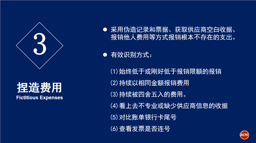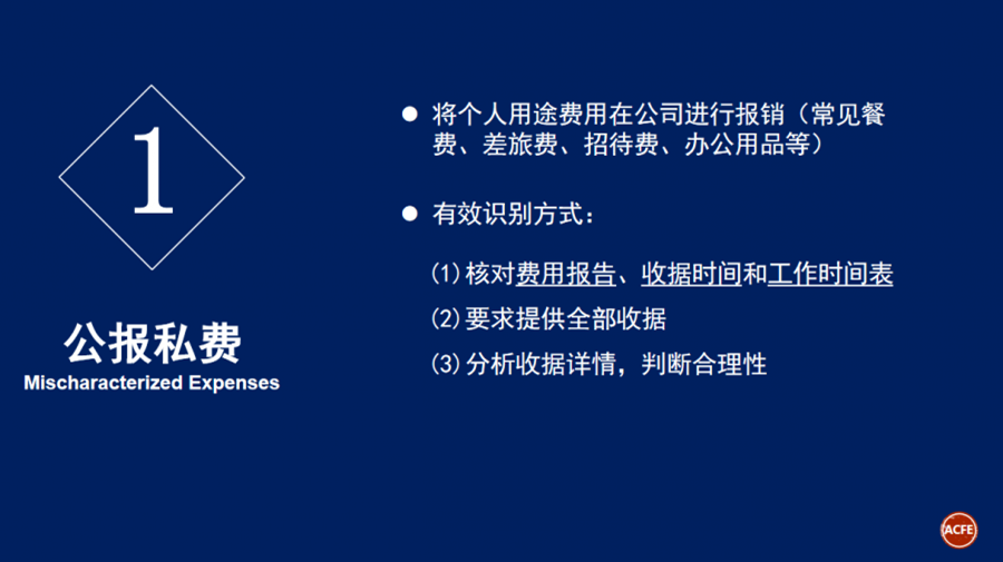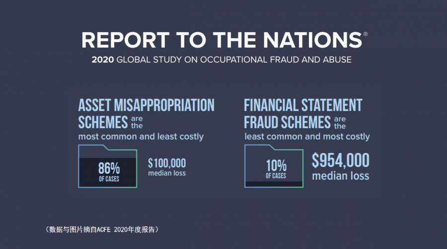 4月23日,亚太企业差旅费控数字化峰会在北京成功举办! 峰会吸引了200余名企业总裁、经理等高级别负责人前来参加;会议围绕“企业差旅费控数字化转型”这一主题开展了十余场精彩纷呈的演讲。 ACFEChina作为此次活动主办方之一参加活动。 同时ACFE 北京分会会长胡玉华(Helen Hu)女士受邀出席本次峰会并发表演讲。 胡会长演讲主题为《费用报销舞弊的识别与防范》,演讲主要内容有: 1. 2020 ACFE Report to the Nations; 2. 费用报销舞弊常见类型与识别; 3. 费用报销舞弊的几点建议。 首先,胡会长为大家分析了《ACFE2020年全球舞弊调查报告》的几个关键点: 图一:本次调查报告基于来自125个国家的2,504份调查报告,其中舞弊案例涉及的直接经济损失超过36亿美元。 图二:ACFE预计,舞弊为包括政府和企业在内的各类组织带来的经济损失约为全年总收入的5%,这个百分比和2018年报告中预测百分比持平。各类案件损失中位值为125,000美元,所涉及案件的平均损失为1,509,000美元。 图三: 挪用资产行为发生率最高(86%的案件涉及),带来损失金额最低(损失中位数100,000美元); 财务报告造假相比发生率最低(10%的案件涉及),但是造成的经济损失最高(损失中位数为954,000美元)。 用一系列报告数据表明舞弊对企业严重的危害性,以及企业进行反舞弊工作的必要性。 图一 图二 图三 接着,胡会长为我们详细介绍了费用报销舞弊常见类型以及如何识别报销舞弊: 1. 公报私费 2. 高报费用 3. 捏造费用 4. 重复报销 最后,关于如何防范费用报销舞弊胡会长给出我们以下建议: 1. 详细的费用报告(时间、地点、金额、事由、参加人等) 2. 尽量要求费用报销的原始收据 3. 要求员工的直接主管批准费用报销 4. 定期抽查与客户相关的费用报告 5. 规定费用必须在一定期限内提交 6. 规范费用管控,可以采取统一采购 7. 职责分离(审批、登记、支付) 8. 加强内部控制,制定定期和专项审计制度 9. 设定“顶层”基调,舞弊零容忍,高调反舞弊 10. 始终保持“专业怀疑度”