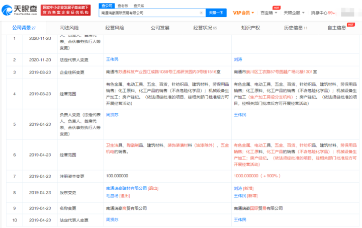 据报道,王伟民在接受采访时表示,南通瑞豪是自己之前帮其他人买的。工商变更记录显示,2019年4月23日,南通瑞豪的注册资本扩大了10倍至1000万元,负责人由周贤苏变为王伟民,同时王伟民、刘涛还新增成为股东,原有股东悉数退出。