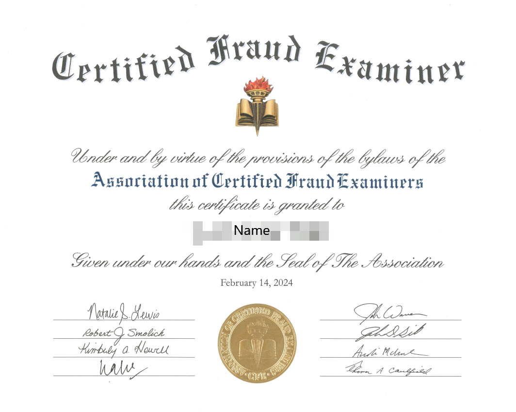 完善的课程体系,将对考生进行系统的舞弊和舞弊风险警示和信号的识别,以帮助企业界定舞弊风险高发区,建立和实施舞弊风险防控计划,做好预防和威慑;掌握舞弊调查的流程和有效的方法和注意事项,撰写合格的调查报告,尽力挽回组织的经济损失,维护组织形象;以及熟悉和舞弊相关的法律法规和司法诉讼流程。根据ACFE协会2024年全球调查报告显示,雇佣CFE的企业,其发现舞弊的速度比没有雇佣CFE的企业要快50%以上,舞弊造成的经济损失也会比没有雇佣CFE的企业要少62%以上。